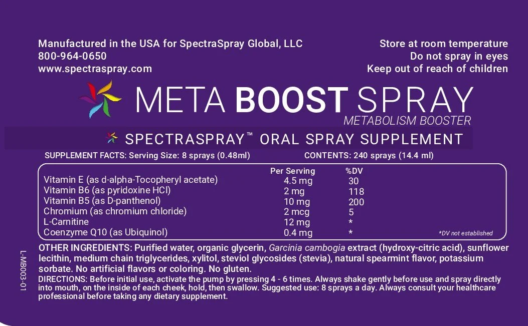 SpectraSpray's new Healthy Weight Loss Support Spray Vitamin kit with B12 Energy + MetaBoost oral sprays will support your weight loss efforts while providing much needed energy to be used 4 sprays twice a day. MetaBOOST oral spray supplement is  a one-of-a kind metabolic booster to support weight loss and healthy blood sugar levels, naturally! It may help promote the burning of unwanted fat in your system. A proper dietary intake along with regular exercise is highly recommended and required for sustainable weight reduction. MetaBoost's unique ingredients are proven to support a healthy metabolism, including Vitamin B5, Vitamin B6, L-Carnitine, Coenzyme Q-10 + Garcinia Cambogia (Hydroxycitric acid). Easy to use, on-the-go sprays you will never forget to take. May help curb carb and sugar cravings when used as advised.